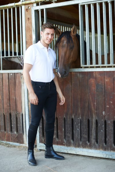 Męskie bryczesy wykonane z wyjątkowo elastycznego materiału. Posiadają silikonowy lej kolanowy. Wysokiej jakości mieszanka bawełny, poliestru i elastanu zapewnia wygodę i zapobiega nadmiernemu poceniu w wysokich temperaturach dzięki naturalnym włóknom bawełnianym. Mankiety nogawek obszyte są materiałem ElastoSoft co zapewnia maksymalny komfort w butach.