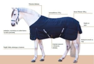 • atrakcyjna derka do stajni z szerokim stebnowaniem i umieszczonymi na zewnątrz pasami krzyżującymi się na brzuchu • z szeroką klapką na ogon i regulowanymi sznurkami na nogach • podwójne zapięcie klamrowe z przodu ze sprzączkami, karabińczykami i pierścieniami w kształcie litery D • materiał zewnętrzny poliester – 300 den • wypełniony termoaktywną włókniną 150 g • oddychający materiał zapewniający optymalne warunki pod derką • przyjemna wewnętrzna podszewka z bawełny/poliestru, która nie drapie sierści