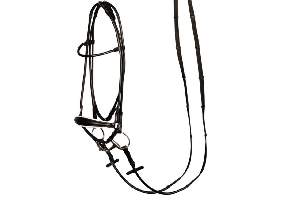 Ogłowie rurkowe Harry’s Horse z nachrapnikiem hanowerskim. Miękko podszyty nachrapnik i nagłówek. W zestawie z rurkowymi wodzami.
